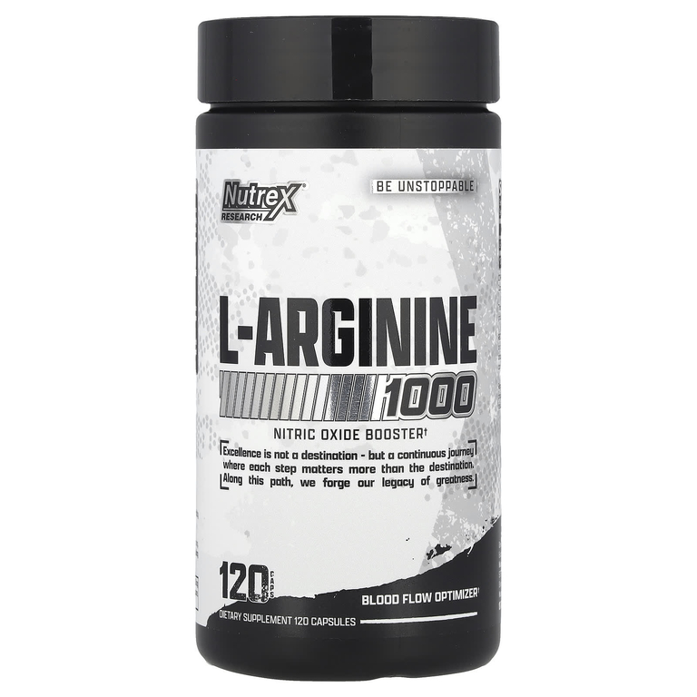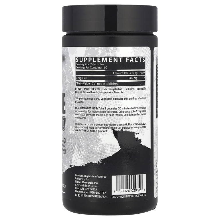 Nutrex Research L-Arginine — это чистый L-аргинин в дозе 1000 мг на порцию (2 капсулы). Аргинин — условно незаменимая аминокислота, играющая ключевую роль в синтезе оксида азота (NO) — мощного вазодилататора, расширяющего кровеносные сосуды и улучшающего кровоток. Формула предназначена для поддержки «пампа» во время тренировок, улучшения доставки кислорода и питательных веществ к мышцам, а также для общего тонуса сосудов и мужского здоровья.