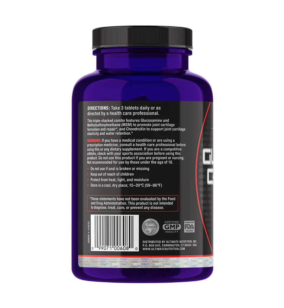 Ultimate Nutrition Glucosamine & Chondroitin & MSM — это комплексный препарат для поддержки здоровья суставов, хрящевой ткани и подвижности опорно-двигательного аппарата. Каждая порция (3 таблетки) содержит 1500 мг глюкозамина HCl, 1200 мг хондроитина сульфата и 1200 мг MSM (метилсульфонилметана) — три ключевых компонента, которые работают в синергии, чтобы замедлить дегенеративные процессы в суставах, уменьшить воспаление и восстановить структуру хрящей. Формула разработана для людей, ведущих активный образ жизни, спортсменов и тех, кто сталкивается с возрастными изменениями в суставах.