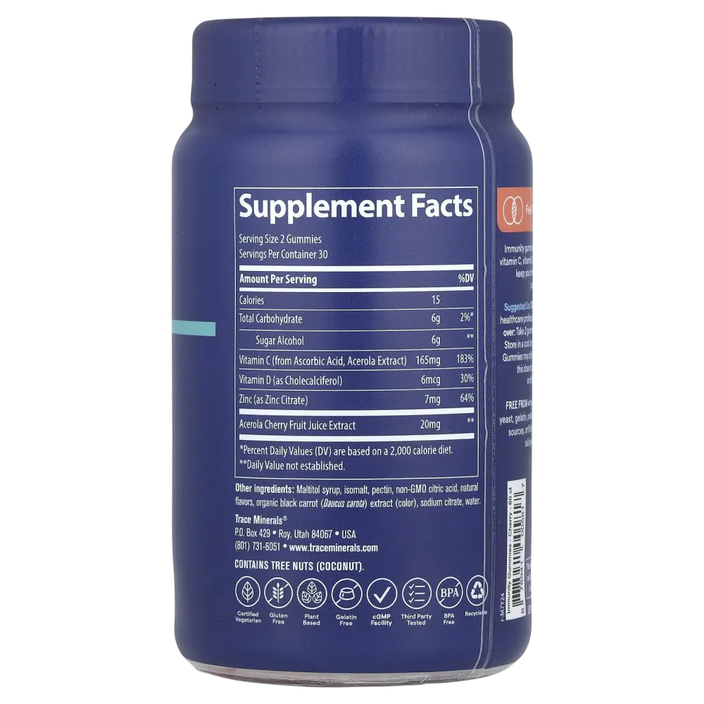 Trace Minerals Immunity — это вкусные жевательные мармеладки с натуральным фруктовым вкусом, разработанные для поддержки иммунной системы у детей и взрослых. Формула содержит высокие дозы витамина С из аскорбиновой кислоты и экстракта ацеролы — природного суперфуда, богатого витамином C и антиоксидантами. Дополненная витамином D3 и цинком — двумя ключевыми нутриентами для иммунитета — добавка помогает организму эффективнее противостоять сезонным вирусам и инфекциям. Мармеладки не содержат искусственных красителей, ароматизаторов и лишнего сахара, вместо него используется сахарный спирт — безопасная альтернатива.