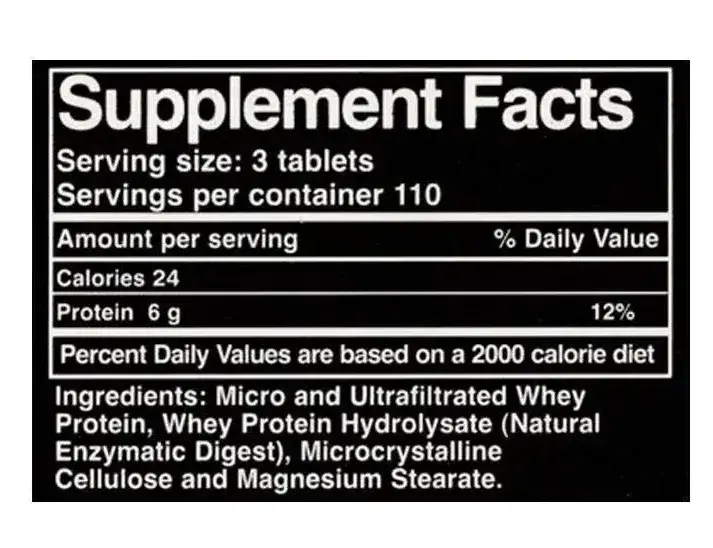 Ингредиенты: Микро- и ультрафильтрованный сывороточный протеин, гидролизат сывороточного протеина (натуральный энзиматический гидролизат), микрокристаллическая целлюлоза, стеарат магния.