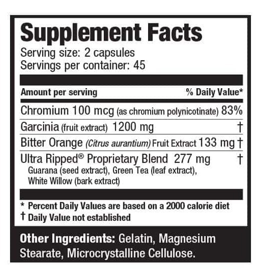 Ultimate Nutrition Ultra Ripper — это мощный термогенный жиросжигатель, разработанный для активного сжигания жира, повышения энергии и подавления аппетита. Формула сочетает высокие дозы кофеина, экстракт гуараны, зелёного чая, горького апельсина (синефрин), гарцинии камбоджийской и коры белой ивы, что обеспечивает комплексное воздействие на метаболизм. Препарат стимулирует термогенез, увеличивает расход калорий, подавляет чувство голода и способствует высвобождению жирных кислот из жировых клеток для их последующего сжигания.
