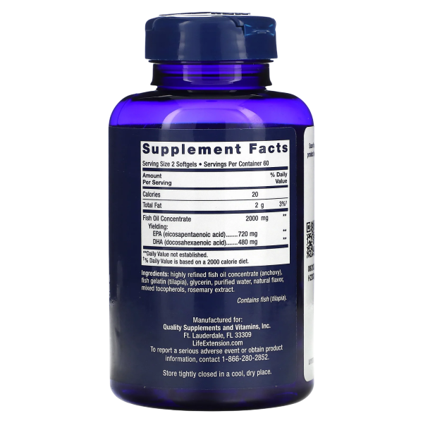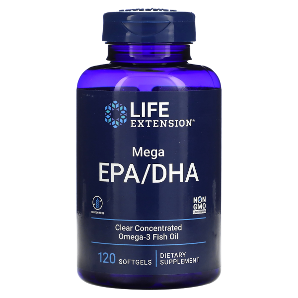 Life Extension Mega EPA/DHA — это высококонцентрированный источник омега-3 жирных кислот, полученных из очищенного рыбьего жира. Каждая порция (2 капсулы) содержит 720 мг эйкозапентаеновой кислоты (ЭПК) и 480 мг докозагексаеновой кислоты (ДГК) — двух ключевых компонентов, необходимых для поддержания здоровья сердца, мозга, глаз и нервной системы. Формула разработана с повышенным содержанием омега-3 для максимального эффекта при интенсивных физических нагрузках, хроническом воспалении и профилактике возрастных заболеваний.