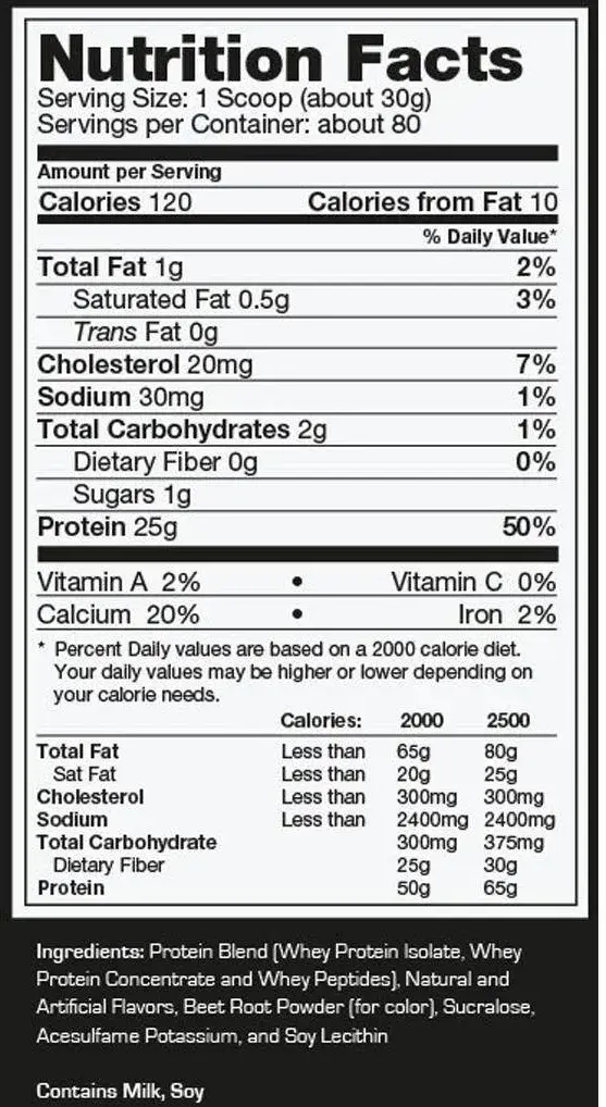 Ингредиенты: Смесь протеинов (изолят сывороточного протеина, концентрат сывороточного протеина, сывороточные пептиды), хлорид натрия, сукралоза, ацесульфам калия, натуральные и искусственные вкусовые добавки, соевый лецитин.