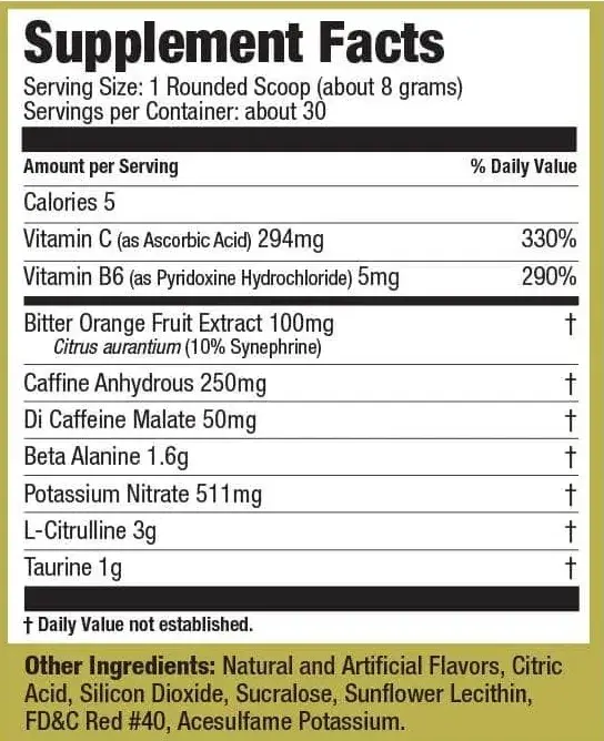 Ultimate Nutrition Pre Gold Pre-Workout — это мощный предтренировочный комплекс, разработанный для максимальной отдачи во время интенсивных тренировок. Формула сочетает в себе энергетические, когнитивные и вазодилатирующие компоненты, направленные на повышение выносливости, силы, концентрации и «пампинга» мышц. Благодаря высокому содержанию кофеина (250 мг), бета-аланина, L-цитруллина и уникальных стимуляторов, таких как синефрин, этот продукт обеспечивает взрывную энергию, острое ощущение «прокачки» и устойчивую мотивацию на весь тренировочный процесс.