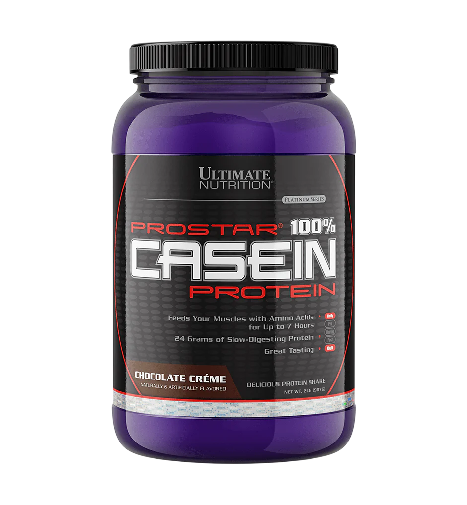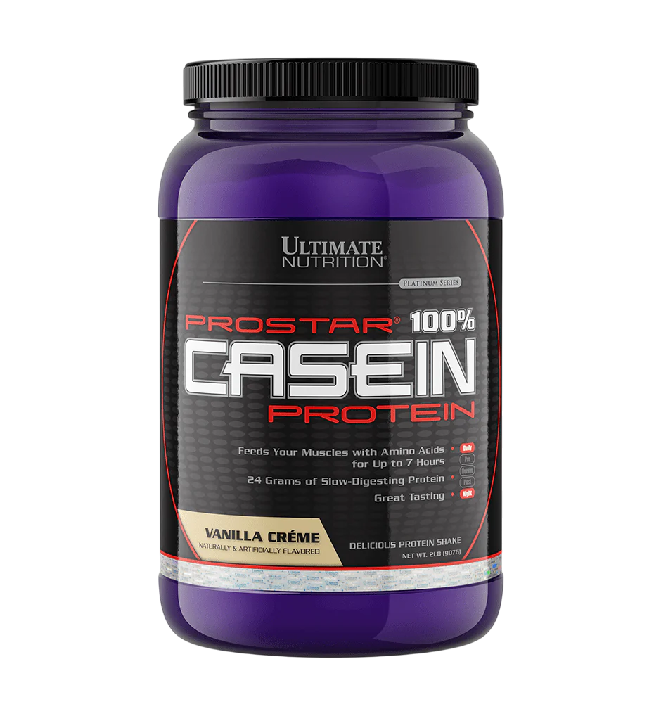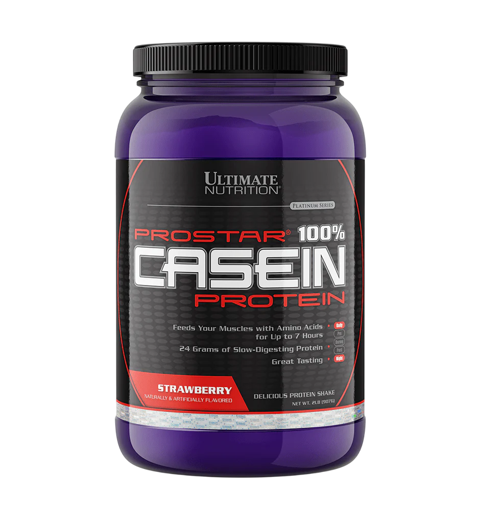 Ultimate Nutrition Prostar 100% Casein — это высококачественный медленно усваиваемый белковый комплекс на основе мицеллярного казеина и гидролизата казеина, полученных из молочной сыворотки. Каждая порция (33 г) содержит 24 г чистого белка, который постепенно высвобождается в течение 6–8 часов, обеспечивая длительную защиту мышц от катаболизма (разрушения). Это делает казеин идеальным источником белка перед сном и между приёмами пищи, когда организм нуждается в стабильном поступлении аминокислот.