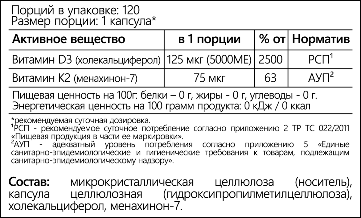- Витамин K2 (менахинон-7, MK-7) — 75 мкг